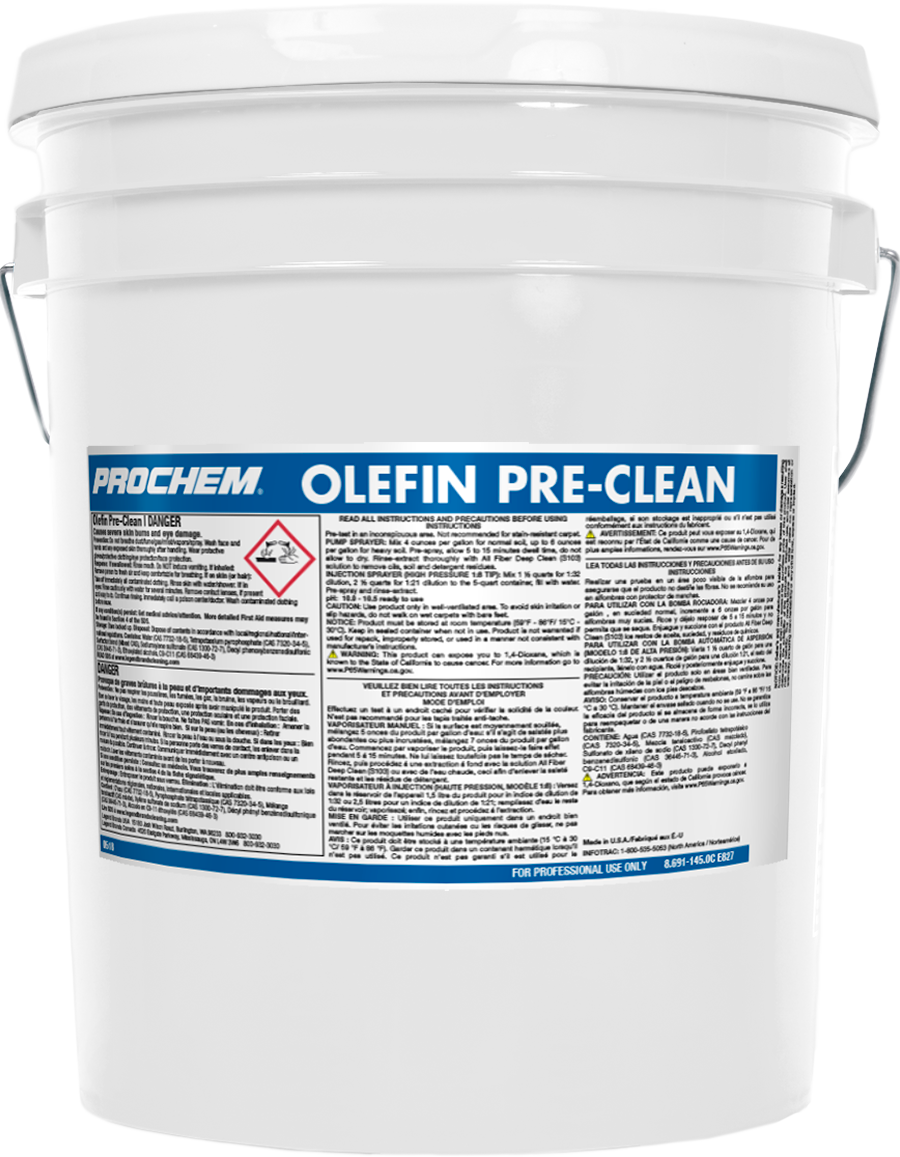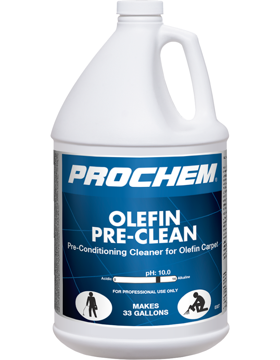 Olefin Pre-Clean is ideal for olefin fiber carpets usually found in offices, clinics, health care facilities, institutions and in many commercial buildings. Its high-grade detergents, solvents and amphoteric surfactants loosen soils adhering to fibers with a static bond plus sticky oils and greases that can cause yellowing and fiber discoloration. Can also be used on soot-damaged synthetic carpets, upholstery and light filtration soil issues.