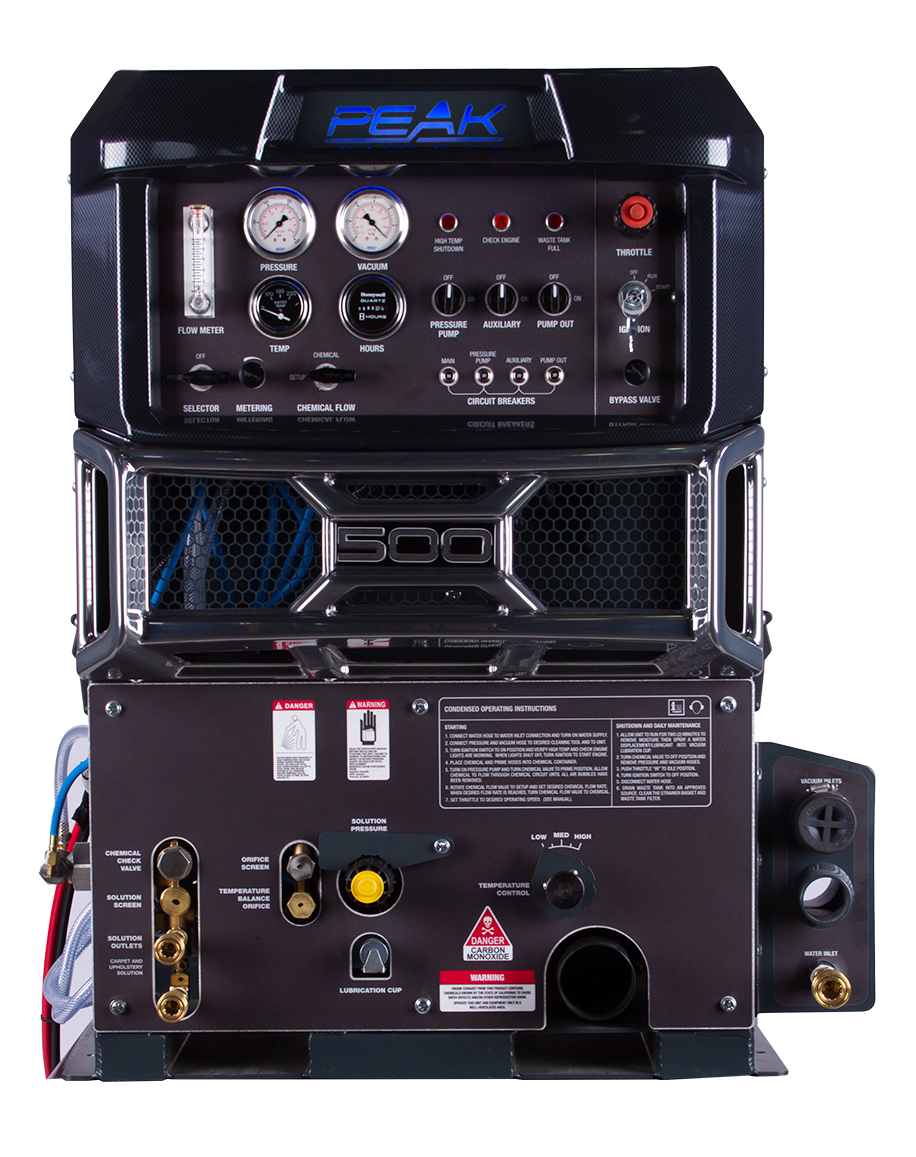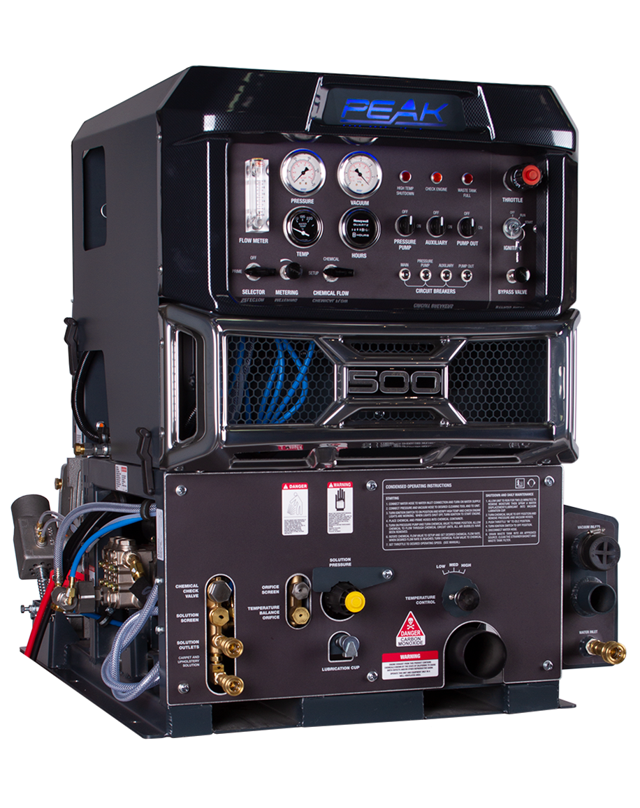 Value-priced and 50-state CARB-compliant, the Peak 500 Truckmount liquid-cooled unit delivers enough heat and vacuum to operate a six-jet wand flat out. Heats fast but sips fuel at only 1 gallon per hour. Lowest cost CARB-compliant machine in its class! Cerakote treatment on exhaust components reduces truckmount and van interior temps.